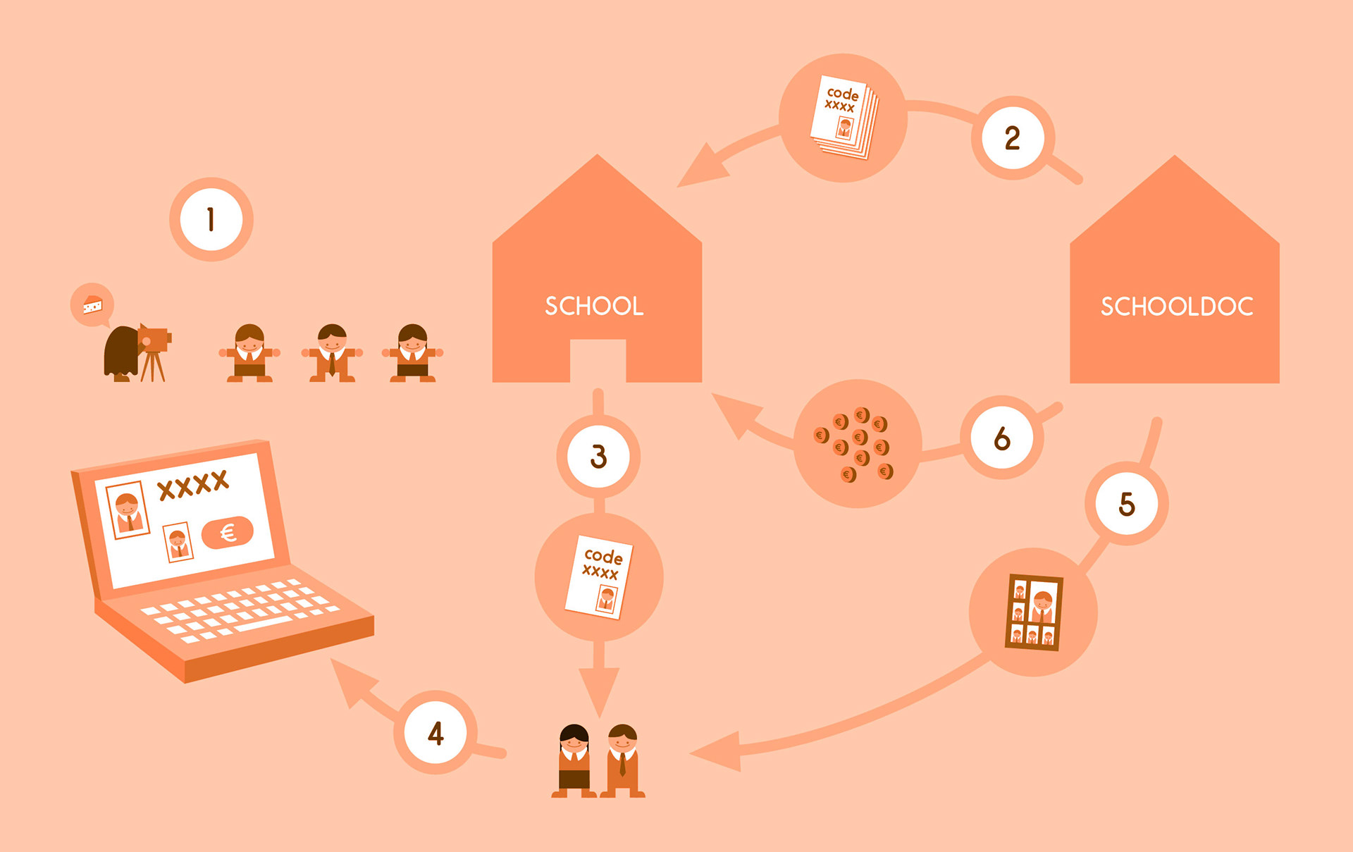 Infographic visualizing how Schooldoc simplifies the complexity of the current Belgian school photography process