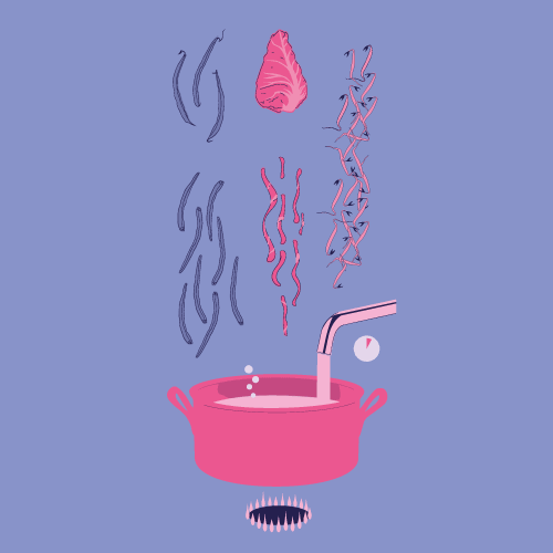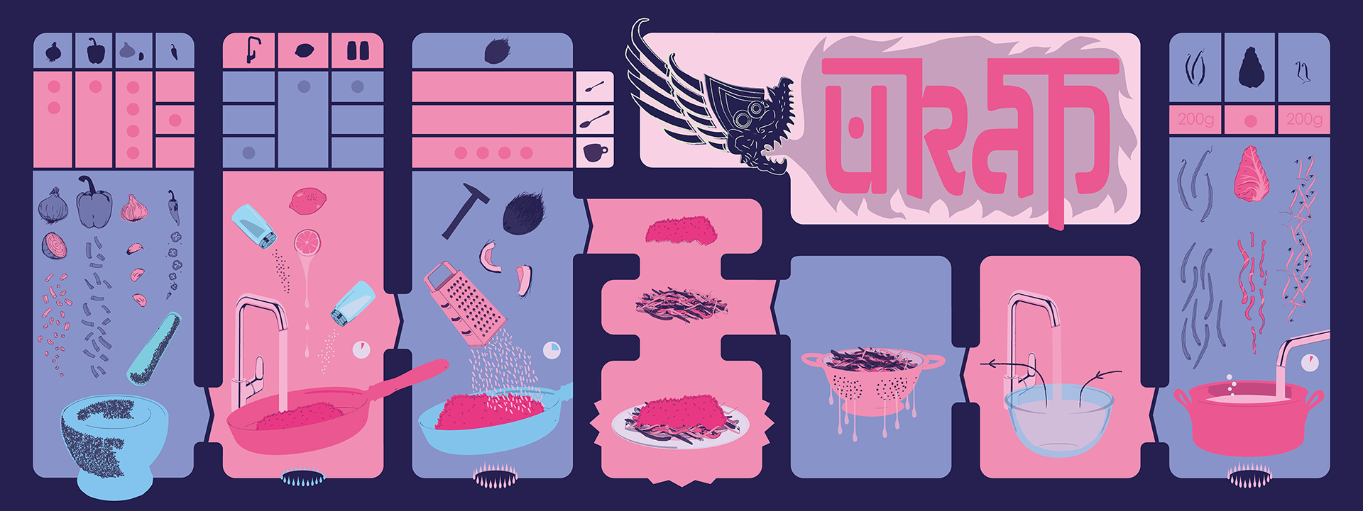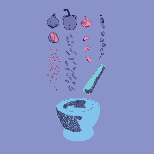 Recipe infographic for a delicious Indonesian spicy coconut and vegetable dish, using only visual imagery and as little text as possible.